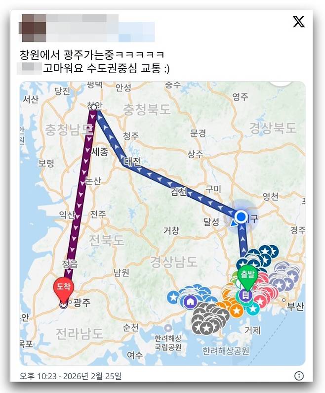 한 X(옛 트위터) 이용자는 지난 25일 "창원에서 광주 가는 중 **(비속어 생략... 기자 주) 고마워요 수도권 중심 교통"이라면서, 창원에서 출발해 천안을 경유해 광주광역시로 이동하는 경로가 표시된 지도를 올렸다.