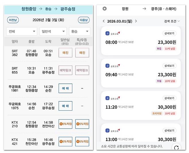 | ▲ 창원중앙역-광주송정역 구간은 KTX로 오송역 환승시 약 3시간 10분~3시간 50분, 무궁화호로 순천역 환승시 약 4시간 40분 소요되고(왼쪽), 창원-광주 고속버스 이용시 약 2시간 50분 걸린다. |