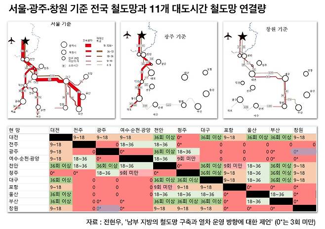 | ▲ 서울·광주·창원 기준 전국 철도망(위)과 11개 대도시간 철도망 연결량. 광주-창원간은 0*(3회 미만)으로 분류됐다. (자료 : 전현우, '남부 지방의 철도망 구축과 열차 운영 방향에 대한 제언') |