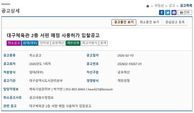 '대구체육관 2층 서편 매점 사용허가 입찰공고'를 통해 매점 운영자가 결정되었다.