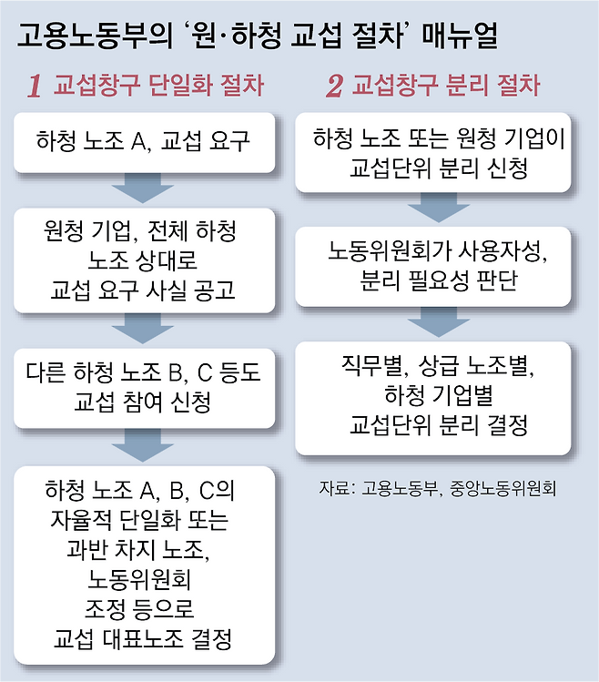 매뉴얼은 하청 노조가 원청 기업에 교섭을 요구할 때 “원청 노조와 교섭 창구 단일화 절차를 거칠 필요가 없다”고 명시했다. 당초에는 원·하청 노조 간 창구 단일화를 하는 방안도 검토됐지만 각각 별도 단위에서 교섭하는 구조를 명확히 한 것이다. 김 장관은 “원·하청을 하나의 교섭 단위로 묶으면 현실적인 충돌이 발생할 수 있다는 점을 감안한 조치”라며 “원·하청 공동 교섭이 이뤄진다면 바람직한 사례가 될 것”이라고 했다.