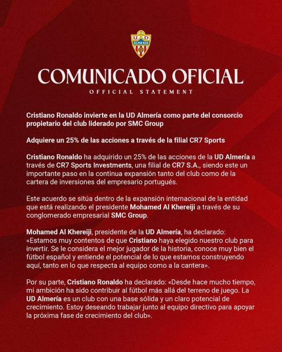 구단은 "호날두가 CR7 스포츠 인베스트먼트를 통해 알메리아 지분 25%를 취득했다. 이는 호날두의 투자 포트폴리오와 구단에 모두 지속적인 확장을 위한 중요한 단계다"라고 전했다.