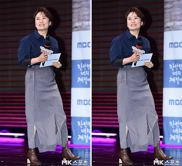 이날 제작발표회에서 박경림은 블루 컬러의 셔츠에 그레이 컬러의 롱스커트를 매치해 한층 가벼운 느낌의 패션을 선보이며 무대에 올랐습니다.