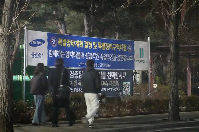 | ▲ 2026년 2월 27일 이재명 대통령이 자신과 김혜경 여사가 공동명의로 보유한 경기도 성남시 분당구 아파트를 매물로 내놓은 가운데 이날 저녁 해당 아파트 단지 내 재건축 관련 현수막 앞으로 행인들이 지나가고 있다. |
