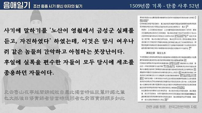 비슷한 시기, 단종 자결설에 대한 직접적인 비판도 나왔습니다. 조선 중종 대의 문신이었던 이자는 <음애일기>에서 단종의 자결설에 대해 "여우나 쥐 같은 놈들의 간악하고 아첨하는 붓장난"이라고 썼습니다.