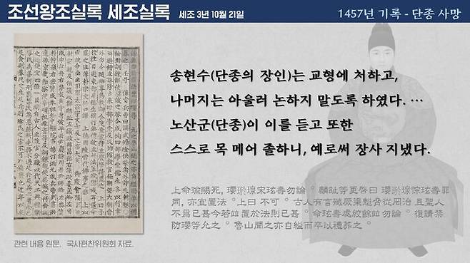 이런 면에서, 단종 사망 시기와 가장 가까운 정사, 조선왕조실록 세조실록의 역사를 가장 먼저 찾아볼 필요가 있습니다.