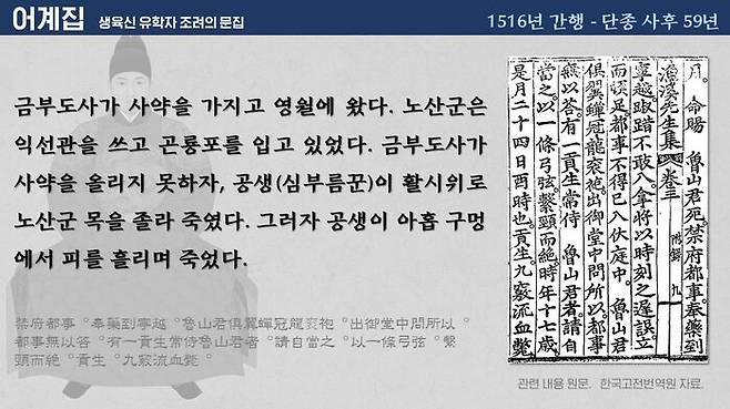 하지만, 당대에도 이에 대한 반박이 나왔습니다. 세조의 왕위 찬탈 이후 벼슬을 버리고 절개를 지킨 6명의 신하, 즉, 생육신 가운데 한 명인 조려는 <어계집>에서 단종 사망 당시의 상황을 다음과 같이 묘사했습니다.