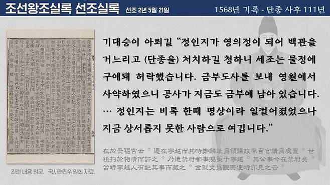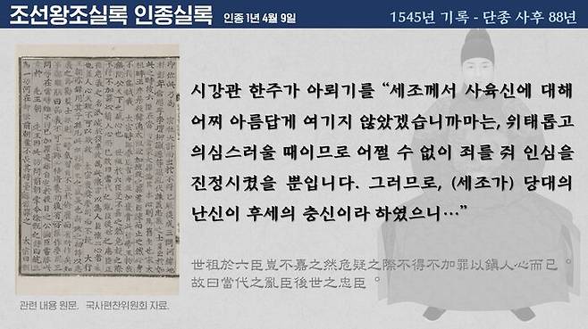 단종 사후 88년, 시강관이었던 한주가 인종에게 "세조가 당대의 난신이 후세의 충신이라고 했다"면서 세조 역시 사육신을 재평가했다는 대목이 있습니다. 인종은 세조의 증손자입니다.