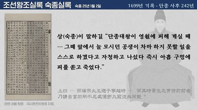 결국, 단종 사후 242년, 당시 왕이었던 숙종의 입을 통해 세조에 의한 단종 타살설은 공식화됩니다. 조계의 <어계집> 내용 거의 그대로 입니다.