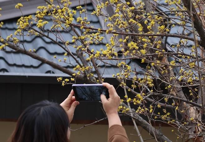 [흐린 날씨를 보인 26일 부산 북구의 한 도로변에 노란 산수유꽃이 활짝 펴 시민들의 눈길을 사로잡고 있다. (사진=연합뉴스)]