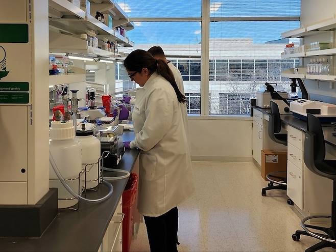 [강병철 특파원 = 미국 메릴랜드주 록빌의 코오롱티슈진의 연구소에서 지난 11일(현지시간) 연구원들이 실험을 진행하고 있다. (록빌(메릴랜드주)=연합뉴스)]