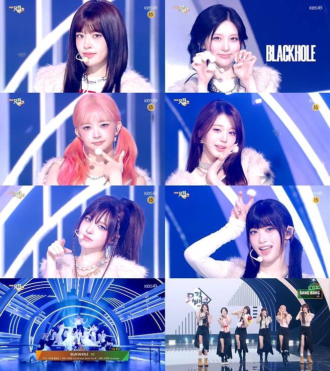 이날 방송에서 아이브는 정규 2집의 또 다른 타이틀곡 'BLACKHOLE(블랙홀)' 컴백 무대로 뮤직뱅크 무대에 올랐다. 퍼 크롭 재킷과 블랙 스커트를 매치한 스타일링으로 등장한 아이브는 특유의 당당하면서도 우아한 무드로 시선을 사로잡았다. 리즈의 몽환적인 음색으로 시작되는 인트로부터 후반부 시원하게 뻗는 안유진의 고음은 아이브의 흔들림 없는 라이브 실력을 증명하며 분위기를 단숨에 끌어올렸다. 여기에 긴 테이블을 활용한 군무는 곡명 '블랙홀'처럼 압도적인 스케일을 자랑했고, 후렴구 가사를 활용해 아이솔레이션과 손을 젓는 '룩앳미 춤'은 강렬한 중독성을 유발했다.
