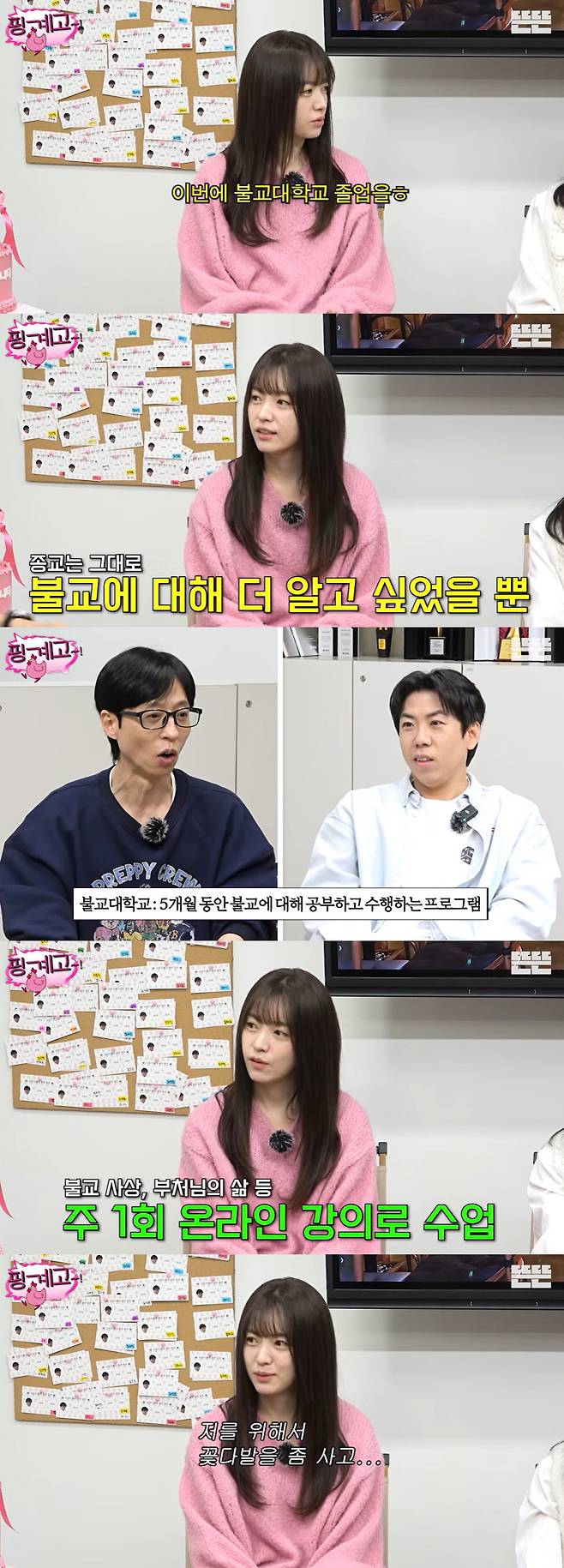유재석은 "대학이 따로 있는 게 아니고 그냥 과정인 거냐. 거기선 뭘 배우냐"고 궁금해했고 한효주는 "불교 이론이라든지 일주일에 한번씩 온라인 수업을 듣는다. 시험은 안 보고 학점도 없다"고 설명했다.
