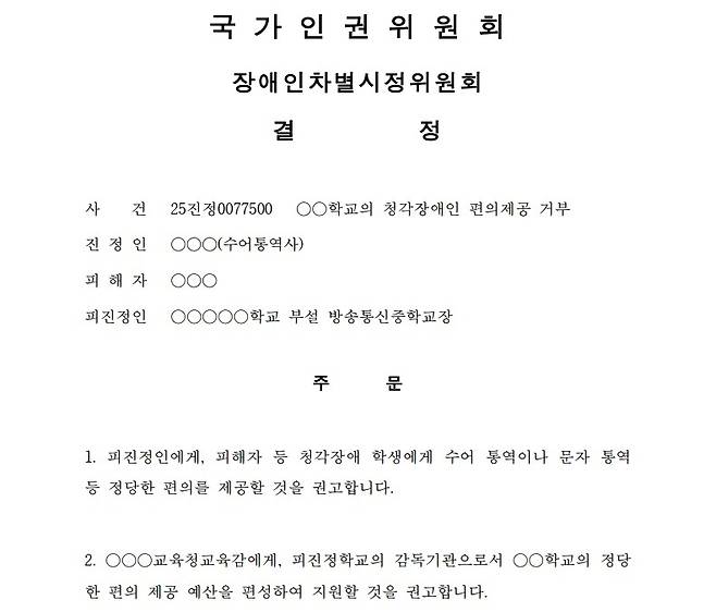 인권위는 해당 학교장에게 피해 학생을 포함한 청각장애 학생들에게 수어통역 또는 문자통역 등 '정당한 편의'를 제공할 것을 권고했다. 또한 감독기관인 도교육청 교육감에게는 관련 예산을 편성해 학교가 편의 제공을 수행할 수 있도록 지원할 것을 함께 권고했다.