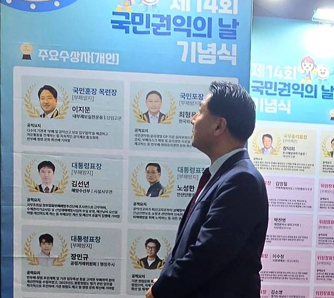 | ▲ 이지문 내부제보실천운동 상임고문이 자신의 국민훈장 목련장 수상을 안내하는 홍보판을 바라보고 있다. |