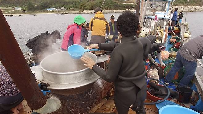 | ▲ 차가운 바다에 들어가기 전 몸을 녹이기 위해 불을 피워 물을 데우는 해녀들의 준비 모습 |