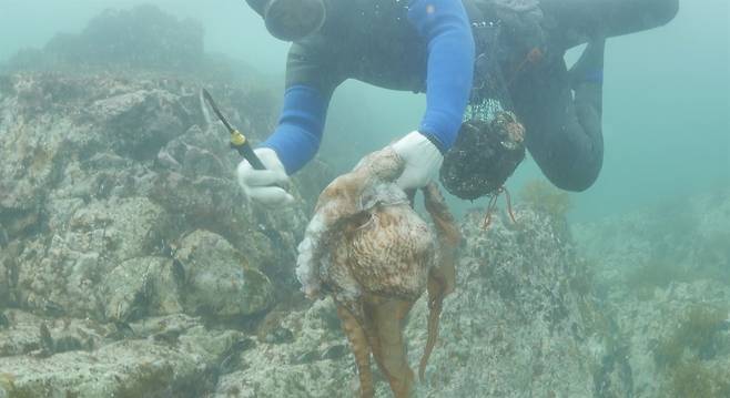 | ▲ 15m 깊이의 바닷속에서 문어를 낚아채는 오용분 해녀 |