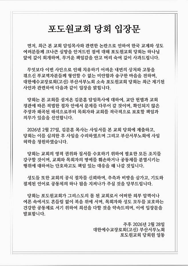 포도원교회 당회는 2월 28일 교회 홈페이지에 발표한 입장문에서 "2월 27일 김문훈 목사가 사임서를 당회에 제출했고, 당회는 이를 심의한 후 사임을 수리하였으며 부산서부노회에 사임 허락을 청원했다"고 밝혔다.