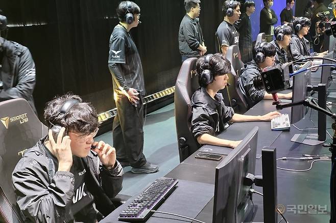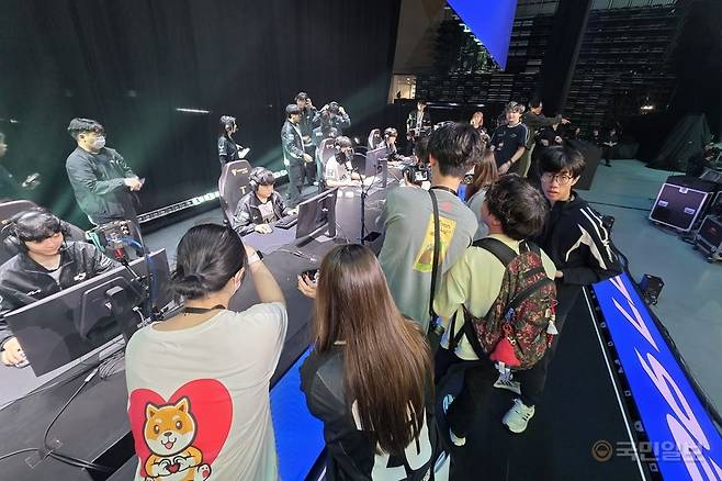 BNK 피어엑스 선수단도 차분하게 손을 풀고 있다. 선수들에 따르면 규모가 큰 외부 경기장에서 경기를 치를 때 관객의 함성이 헤드셋의 방음 기능을 뚫고 들어오기도 한다. 경기 중에 치명적인 의사소통 오류가 생기지 않게 이때 서로의 마이크와 헤드셋 볼륨을 적절하게 설정해야 한다.