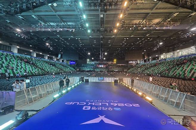 선수석에서 바라본 카이탁 아레나의 전경은 이렇다. 이곳엔 곧 약 1만여 명의 관객이 입장할 예정이다. 1층에는 앞뒤 높낮이 차이 없이 의자가 길고 가지런하게 놓여 있다.