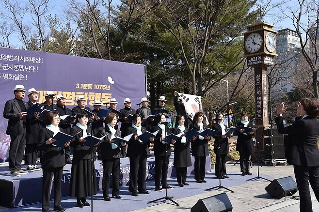 | ▲ ‘3.1운동 107주년! 일본전쟁범죄 사죄배상·한미일군사동맹 반대·한반도 평화실현! 대전평화행동’에서 대전평화합창단이 합창 공연을 하고 있다. |