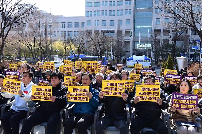 박규용 대표는 이어 "3.1운동 107주년을 맞은 오늘, 우리는 일본 정부의 군사 대국화와 이를 뒷받침하는 한미일 군사협력 구조를 단호히 규탄한다"며 "우리는 한반도가 다시는 미국에 의한 전쟁의 전초기지로 이용되지 않도록 모든 실천에 나설 것을 선언한다"고 목소리를 높였다.