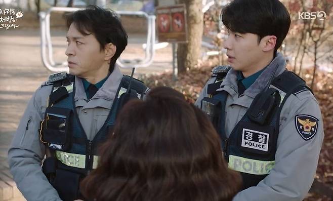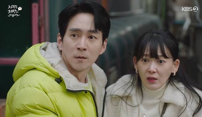 28일 KBS 2TV 주말드라마 '사랑을 처방해 드립니다' 9회에서는 불륜 남녀 민용길(권해성 분)과 이희경(김보정 분)이 마을에서 스킨십을 하다 딱 걸리는 모습이 전파를 탔다. 이날 양동숙(조미령 분)은 남편 민용길의 불륜녀를 목도하기 직전, 이들 가문의 사연을 아는 경찰들이 막아서 얼굴을 확인하지 못한다.