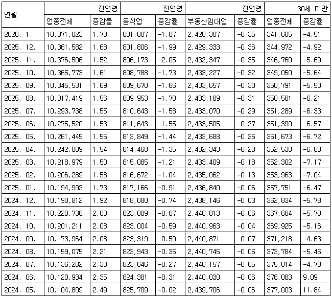 이 업종은 2024년 4월(243만7천988명) 이후 22개월 연속 감소했다. 2024년 3월에 반짝 늘었을 뿐 사실상은 2023년 11월부터 계속 감소세다.