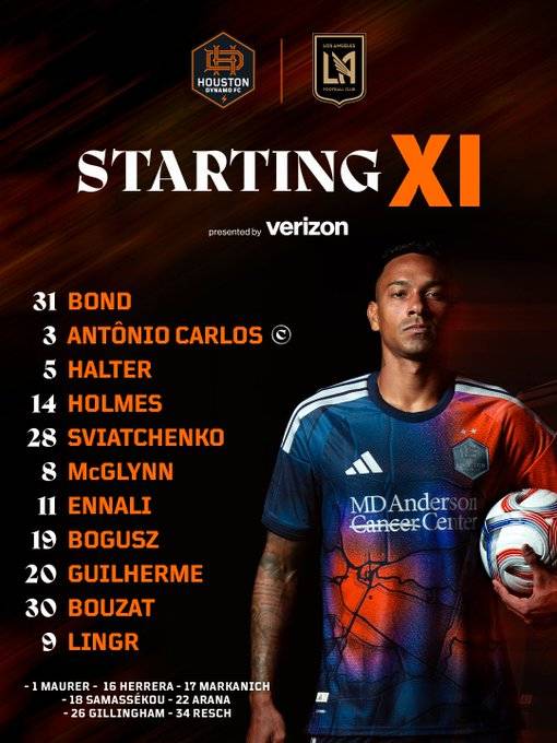 이에 맞서는 벤 올슨 감독의 휴스턴은 3-4-2-1 포메이션으로 응수했다. 조나단 본드가 골키퍼 장갑을 끼고, 루카스 할테르-안토니오 카를로스-에릭 스비아트첸코가 스리백을 이룬다. 중원에는 로렌스 엔날리-잭 맥글린-아구스틴 보자트-듀안 홈즈가 포진하고, 길례르미 아우구스투와 마테우시 보구시가 2선에서 온드르제이 린그르를 지원한다.