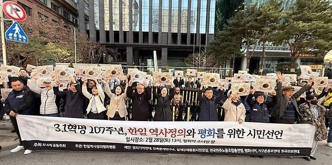 한일역사정의평화행동 등 615개 시민사회단체가 107주년 3.1혁명을 하루 앞둔 2월 28일 오후 1시 서울 종로구 일본대사관 앞 평화의 소녀상에서 기자회견을 열어 "침략과 역사의 부정의 시대를 넘어 정의와 평화의 새역사를 써야 한다"고 강조했다.