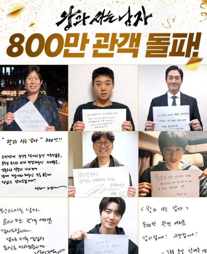 배우들 역시 친필 감사 메시지를 공개했다. 광천골 촌장 엄흥도 역의 유해진은 “생각지도 못한 큰 사랑. 진심으로 감사드립니다! 건강하세요^^”, 어린 선왕 이홍위 역의 박지훈은 “여러분들께서 사랑해주셔서 영화 '왕과 사는 남자'가 800만을 달성했습니다! 정말 감사합니다! 언제나 늘 열심히 하겠습니다♡ 행복하세요!” , 권력자 한명회 역의 유지태는 “내 인생에 800만 영화를 함께했다는 것만으로 이미 성공한 배우입니다. 진심으로 감사드립니다”라고 벅찬 소감을 드러냈다.
