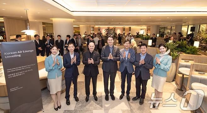 (서울=뉴스1) 임세영 기자 = 정식 개장에 앞서 지난달 26일(현지시각)부터 양일간 LA 국제공항 대한항공 신규 라운지에서 열린 사전 공개 행사에서 조원태 한진그룹 회장(왼쪽에서 네 번째), David Pacey 대한항공 기내식기판 및 라운지 부문 부사장(왼쪽에서 세 번째), 이진호 대한항공 미주지역본부장(왼쪽에서 다섯 번째), 황오렬 대한항공 로스앤젤레스공항지점장(왼쪽에서 두 번째), 강기택 아시아나항공 미주지역본부장(왼쪽에서 여섯 번째) 등 관계자들이 기념촬영을 하고 있다. (대한항공 제공. 재판매 및 DB 금지) 2026.3.1/뉴스1