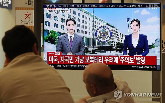 (영종도=연합뉴스) 김주형 기자 = 미국과 이스라엘의 공격으로 중동 지역 긴장이 급격히 고조되며 두바이행 노선 등이 결항한 가운데 1일 인천공항에서 외국인들이 관련 뉴스를 바라보고 있다. 2026.3.1