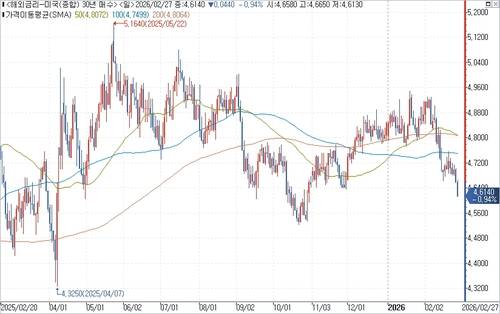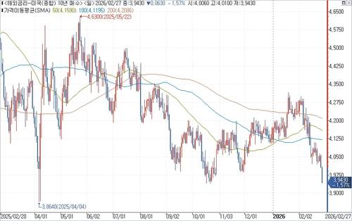 연합인포맥스의 해외금리(화면번호 6533)에 따르면 지난달 27일(이하 현지시간) 10년 만기 미 국채 수익률은 전주 대비 14.20bp 하락한 3.9430%를 나타냈다. 주간 종가 기준으로 2024년 10월 이후 처음으로 시장이 주시하는 4.0% 선을 내줬다.
