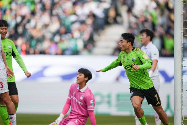 그러나 한순간의 실수는 곧 실점으로 이어졌다. 전반 25분 상대 수비가 걷어낸 볼을 갈레고가 몸으로 막아내며 기회를 만들었다. 곧바로 이어진 역습에서 송범근과 일대일 상황을 맞았고, 침착하게 마무리하며 1-1을 만들었다. 승격팀의 집요함이 드러난 장면이었다.