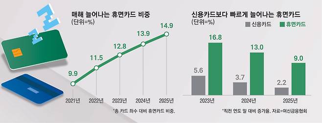 1일 여신금융협회 통계에 따르면 국내 발급된 전체 신용카드 대비 휴면카드 비중은 매년 증가하고 있다. 2021년까지만 해도 10% 이하였던 휴면카드 비중은 2022년 11.5%, 2023년 12.8%, 2024년 13.9%로 매년 상승했다. 지난해에는 휴면카드 비중이 14.9%까지 상승했다. 이는 여신금융협회가 통계를 집계한 이후 가장 높은 숫자다.