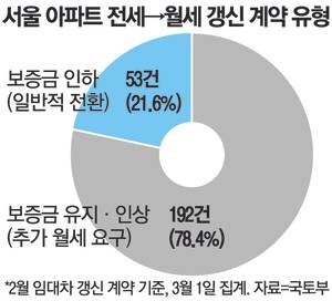 전세 계약이 월세로 바뀌는 흐름도 수치로 확인된다. 이날 국토교통부 집계 기준 2월 서울 아파트 월세 갱신계약은 총 2658건으로, 이 중 9.2%에 해당하는 245건이 기존 전세에서 월세로 전환된 것으로 나타났다.