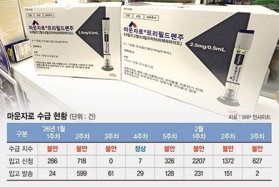 1일 의약품 데이터 분석 플랫폼 BRP인사이트에 따르면 마운자로 프리필드펜주 5.0㎎의 수급 지수는 1월 5주차부터 2월 3주차까지 연속으로 '불안' 상태다. 2월 3주차에는 전국 약국에서 627건의 입고 신청이 들어왔지만, 실제 발송된 물량은 단 두 건에 그쳤다. 이른바 '비만약 성지'로 불리는 서울 종로5가·종로3가 일대 대형 약국 입구에는 '마운자로 전 용량 품절'이라는 안내문이 나붙었고, 일부는 설 연휴 전 예약 고객에게만 제한적으로 판매하는 상황까지 벌어졌다.