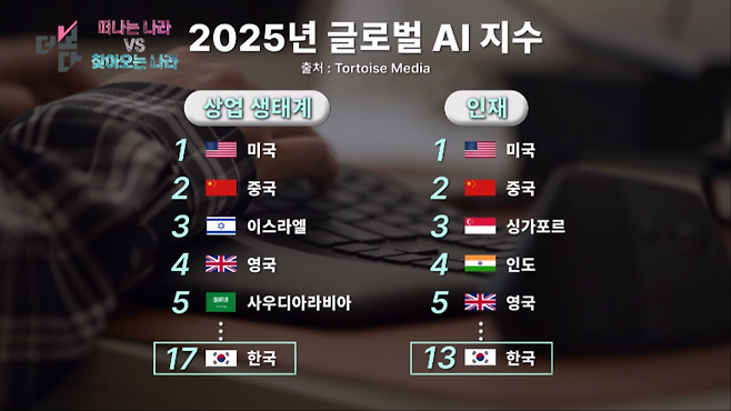 영국과 비교하면 고작 한 계단 차이로 보이지만, 세부 항목을 들여다보면 한국의 AI 상업 생태계는 17위, AI 인재는 13위에 그칩니다.