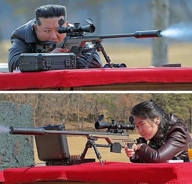 | 신형 소총 쏘는 김정은-주애… 딸 사격 모습도 공개 김정은 북한 국무위원장이 지난달 27일 새로 개발된 신형 소총을 조준 사격하고 있다(위 사진). 김 위원장의 딸 주애가 사격을 하는 모습도 공개됐다. 북한 노동신문은 지난달 28일 “경애하는 김정은 동지께서 27일 당 중앙위원회 본부에서 주요 지도 간부들과 군사지휘관들을 만나시고 특별히 준비하신 선물을 수여하시었다”고 보도했다. 노동신문 뉴스1 |