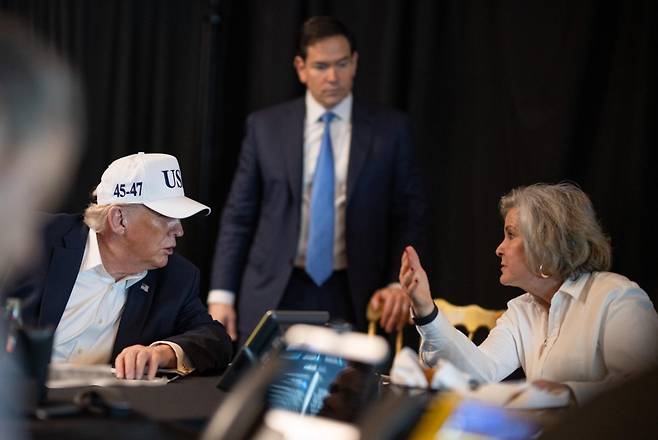 | 마러라고 리조트서 진두지휘 도널드 트럼프 미국 대통령(왼쪽)이 지난달 28일(현지 시간) 플로리다주 사저 마러라고 리조트의 상황실에서 마코 루비오 국무장관(가운데), 수지 와일스 백악관 비서실장 등으로부터 이란 공습, 이란 최고 지도자 알리 하메네이 사망 관련 상황을 보고받고 있다. 팜비치=AP 뉴시스 |