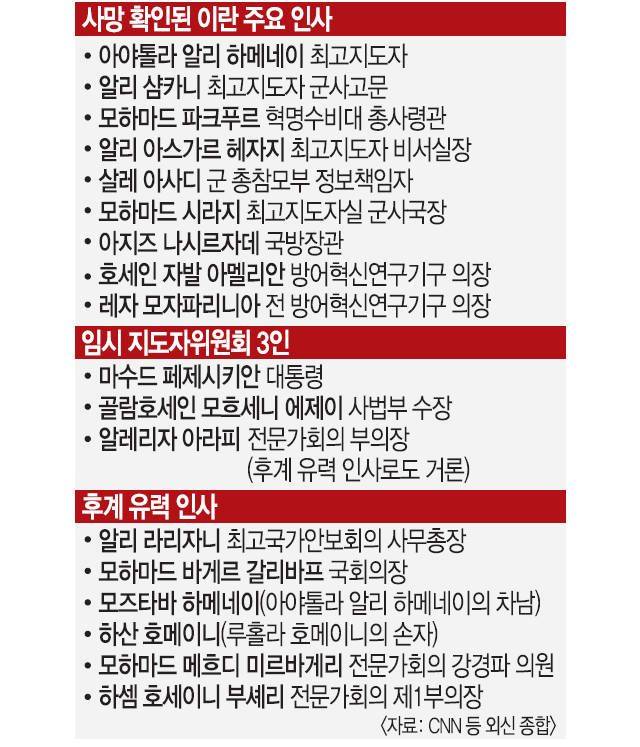 이란 국영 매체들은 “헌법 111조를 근거로 페제시키안 대통령과 골람호세인 모흐세니 에제이 사법부 수장, 알리레자 아라피 전문가회의 부의장의 3인으로 지도자위원회를 구성해 최고지도자의 유고에 따른 임무와 권한을 대행한다”고 밝혔다.