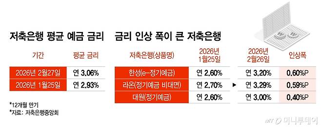저축은행 정기 예금 금리가 빠르게 오르고 있다. 한 달 새 예금 금리를 0.60%P(포인트) 올린 곳도 있다. 코스피 지수가 6000을 돌파하는 등 주식 시장에 불이 붙으면서 저축은행도 수신 이탈 방지에 힘쓰는 모습이다.