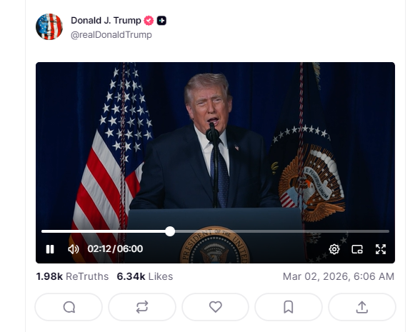 도널드 트럼프 미국 대통령은 1일(현지시간) 이란에 대한 군사공격이 “모든 목표가 달성될 때까지 계속될 것”이라고 밝혔다. 트럼프 대통령은 장거리 미사일과 핵무기로 미국에게 심각한 위협을 가한 이란 정권을 공격한 것은 “정당한 행동이며 자유 국민이 짊어져야 할 의무이자 책임”이라고 주장했다.