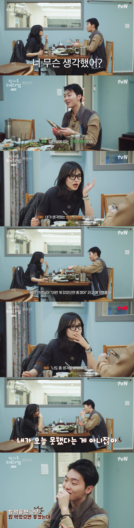 [OSEN=박근희 기자] '방과후 태리쌤’ 배우 김태리가 식사 자리에서도 멈추지 않는 뜨거운 교육 열정으로 보조 선생님 최현욱을 압박했다.