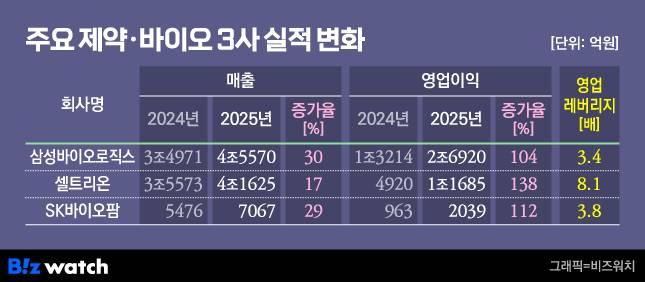 바이오 3사, 매출 뛸때 영업익 날아...'레버리지 매직'