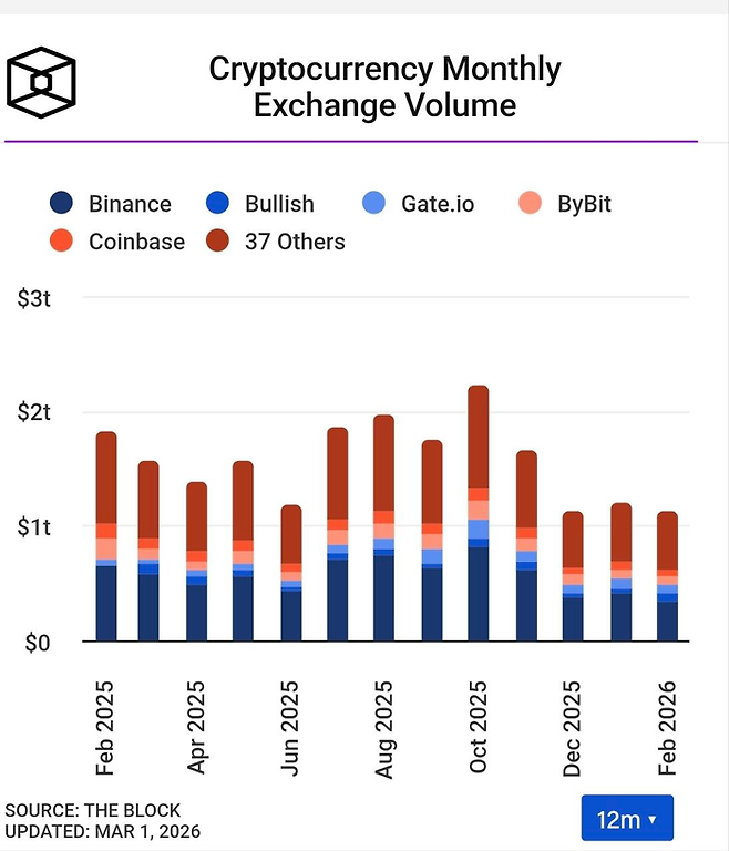 2일 더블록에 따르면 전세계 가상자산거래소의 1월 현물 거래 대금은 1조1300억달러로 집계됐다.