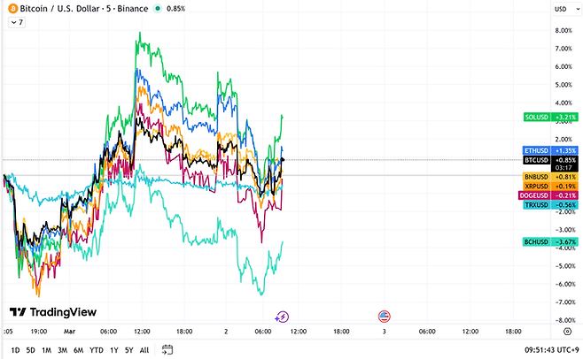 시가총액 10위 이내 주요 가상자산들도 상승세다. 같은기간 솔라나는 3.21% 올랐고, 이더리움과 BNB도 1.35%, 0.81% 상승했다. 도지코인, 트론, 비트코인캐시는 0.21%, 0.56%, 3.67% 하락했다.