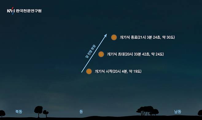 오후 6시49분48초부터 달이 일부분 가려지기 시작해, 오후 8시4분이 되면 달이 지구 그림자에 완전히 들어간다. 이후 약 1시간 동안 개기월식이 진행된다. 이때 달은 희미한 붉은색으로 변한다.