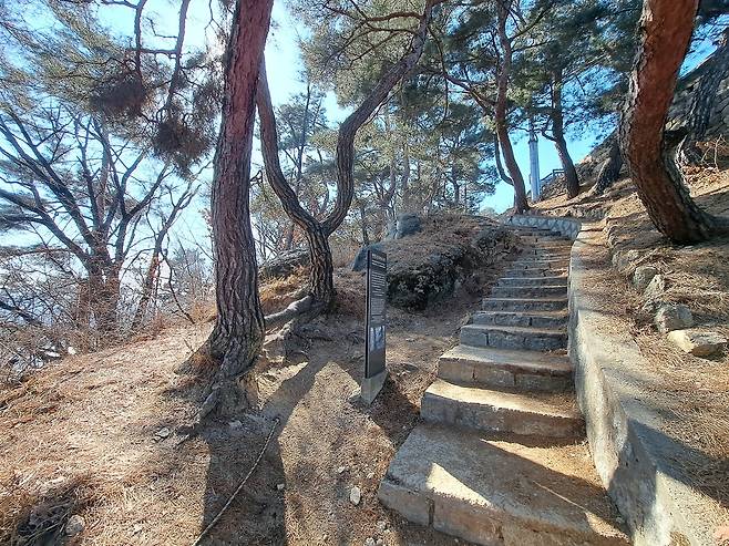 | ▲ 부부 소나무 인왕산 오르는 중턱, 뿌리가 이어진 소나무 두 그루가 계단 옆에 서 있다. |
